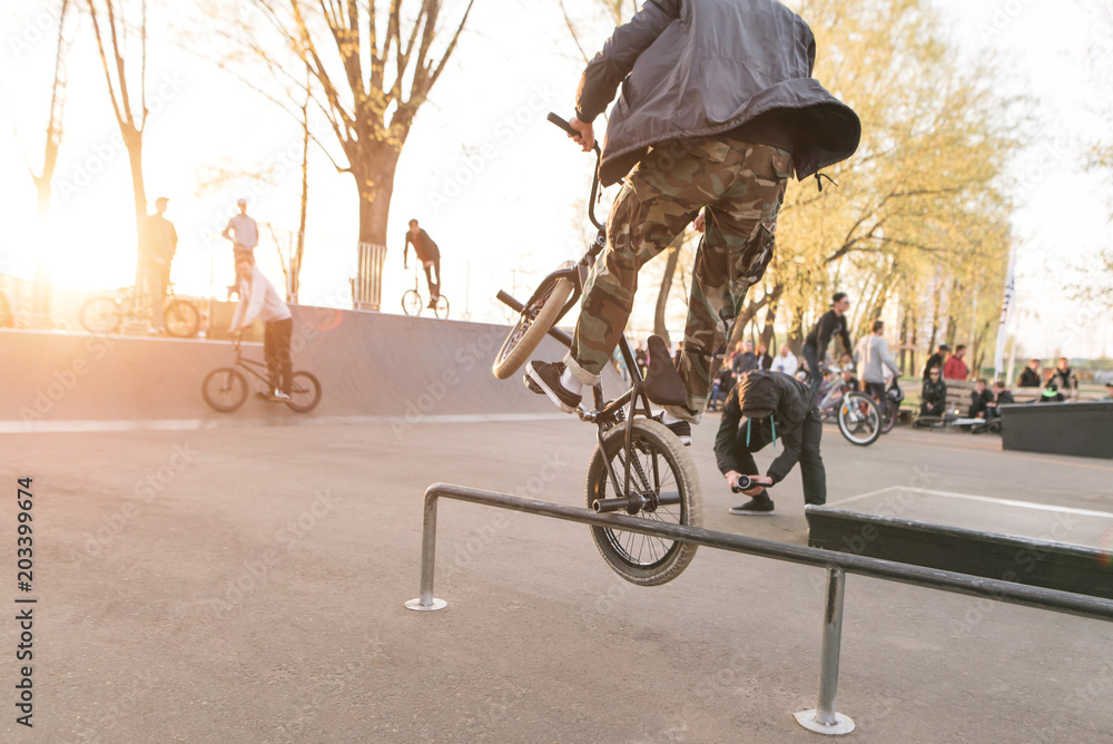 Crazy BMX rider performs tricks in the skate park on the