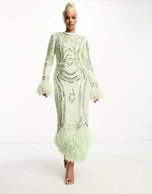 Asos clearance sequin dress, ASOS DESIGN modest long sleeve embellished sequin maxi dress with faux feather trim in mint clearance