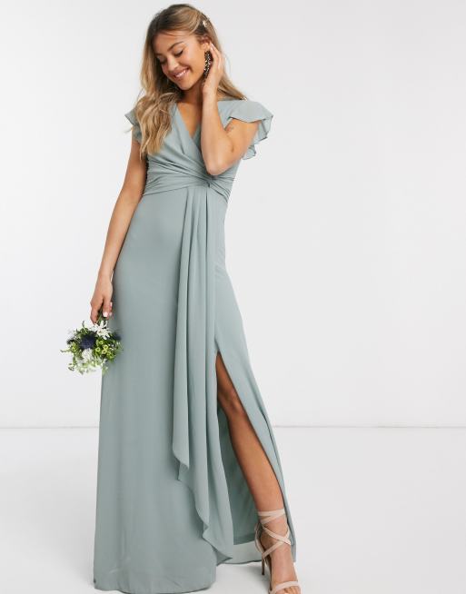 TFNC bridesmaid flutter sleeve ruffle detail maxi dress in sage