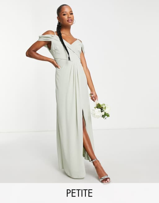TFNC Petite Bridesmaid drape shoulder wrap dress in sage green