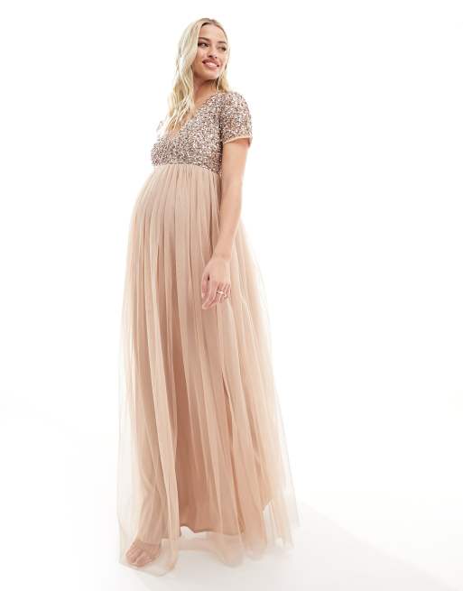Maya Maternity Bridesmaid long sleeved maxi dress with delicate sequin and tulle skirt in taupe blush