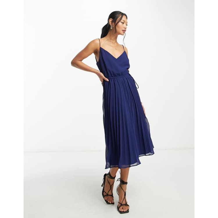 ASOS DESIGN pleated cami midi dress with drawstring waist in navy