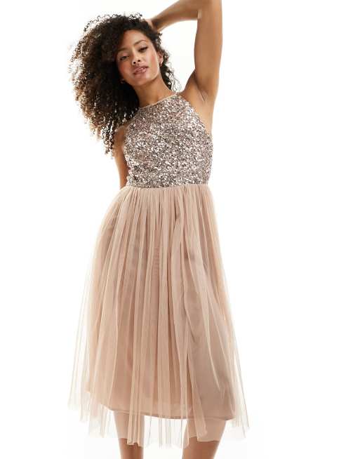Asos maya bridesmaid clearance dresses, Maya Bridesmaid halterneck midi tulle dress with tonal delicate sequins in muted blush clearance
