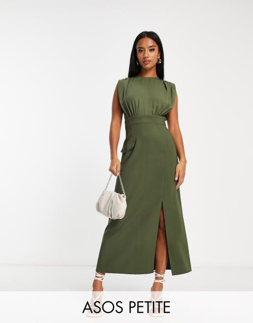 ASOS DESIGN Petite blouson sleeveless midi dress with pocket and split detail in khaki