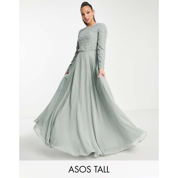 ASOS DESIGN Tall Bridesmaid maxi dress with long sleeve in pearl and beaded embellishment in olive