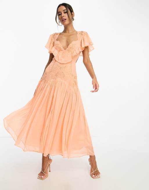 ASOS DESIGN lace insert pleated midi dress in peach ASOS
