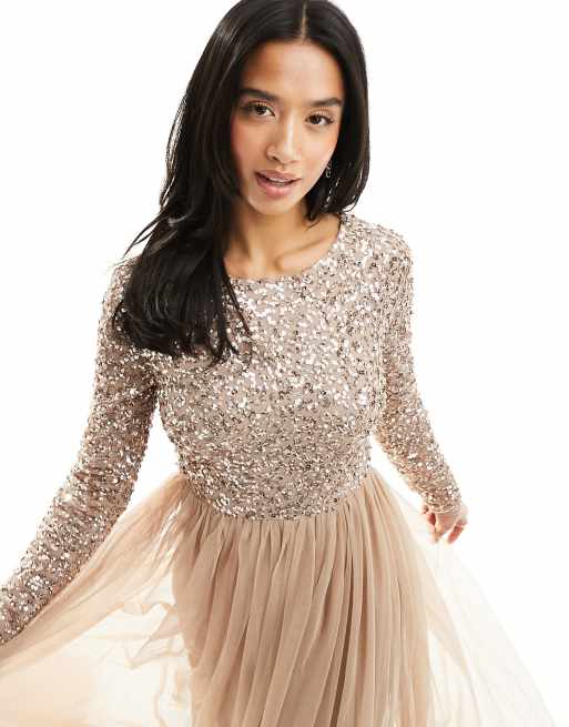 Maya Bridesmaid long sleeve maxi tulle dress with tonal delicate sequins in taupe blush