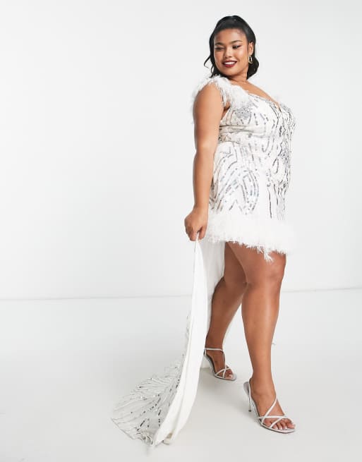 ASOS LUXE Curve embellished gemstone mini dress with faux feathers with train in white