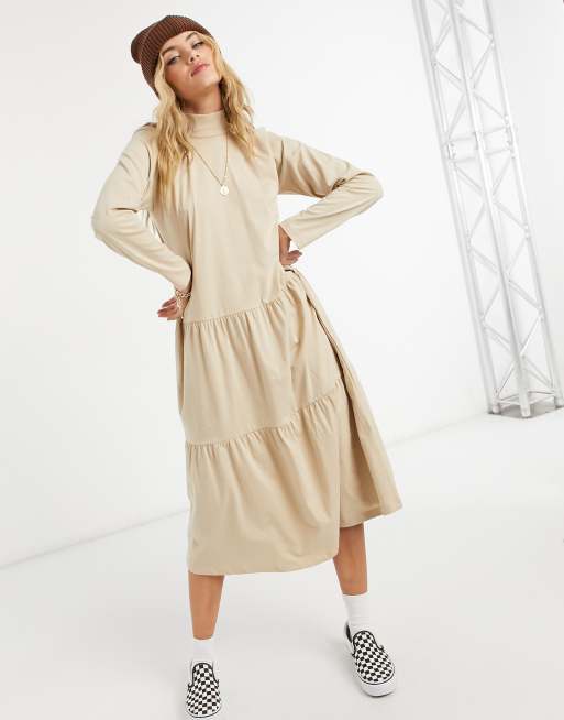 ASOS DESIGN smock midi dress with tiered hem in beige