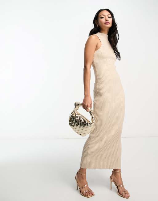 ASOS DESIGN high neck tuck midi pencil dress in beige