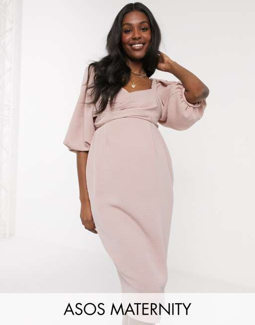 ASOS DESIGN Maternity wrap front midi dress with puff sleeves in pink