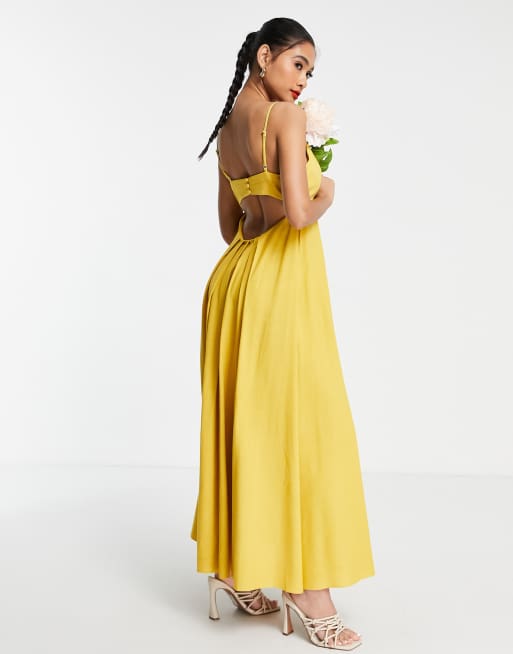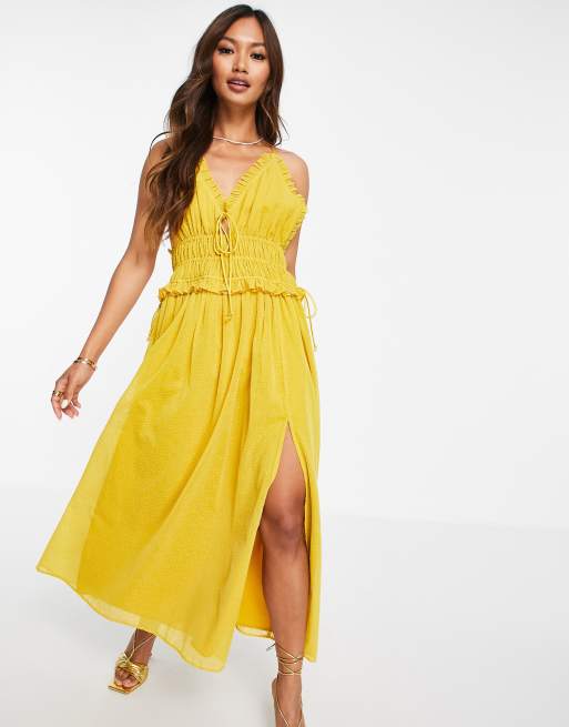 ASOS DESIGN strappy textured spot detail midi dress with ruched waist in yellow