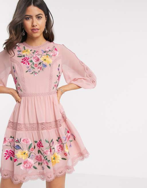 ASOS DESIGN embroidered mini dress with lace trims in Pink