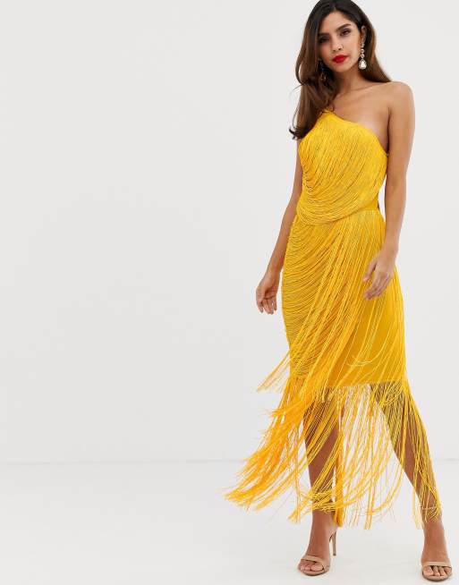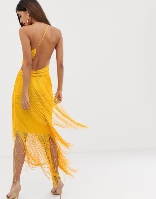 Asos yellow fringe clearance dress, ASOS DESIGN tiered midi fringed dress with cross back detail in gold clearance