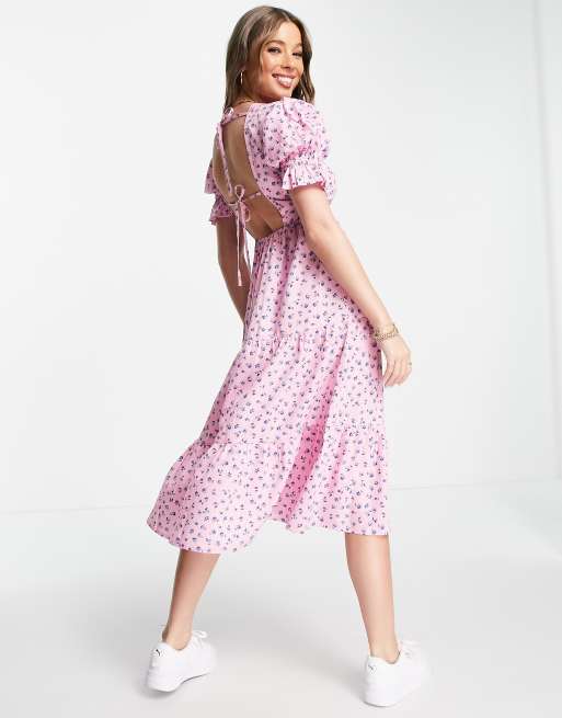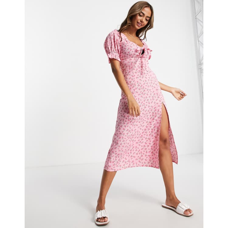 Influence puff sleeve midi tea dress in pink floral print ASOS