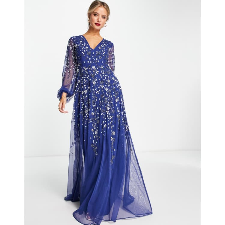 ASOS DESIGN maxi dress with blouson sleeve and delicate floral embellishment in navy