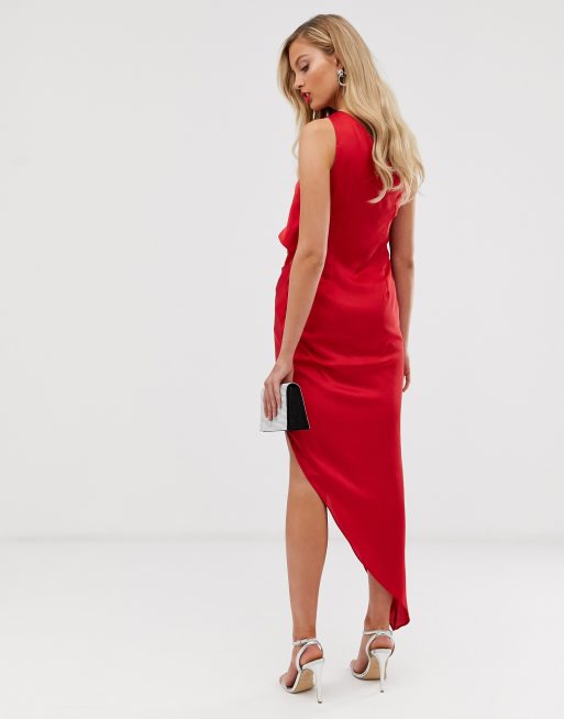 ASOS DESIGN satin one shoulder drape midi dress in red