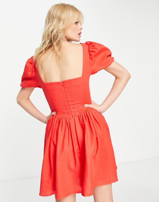 ASOS DESIGN corset linen mini skater dress with puff sleeve in red