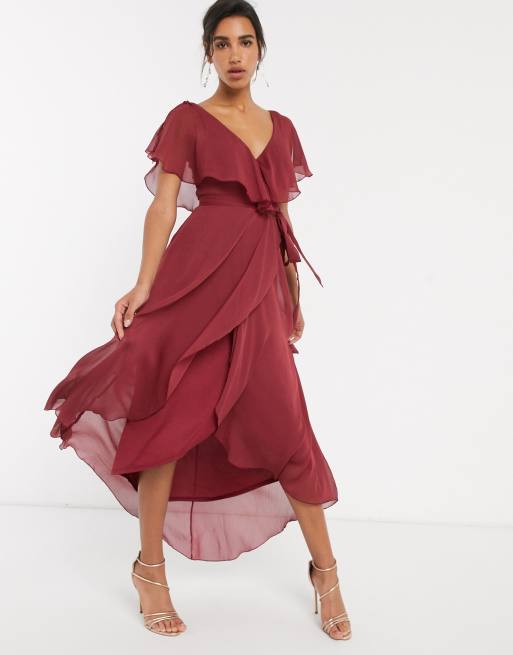 ASOS DESIGN split sleeve cape back dipped hem maxi dress with tie shoulder