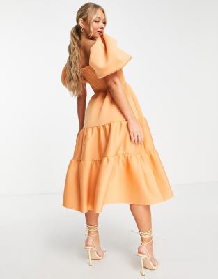 ASOS DESIGN shirred puff sleeve tiered prom midi dress in apricot