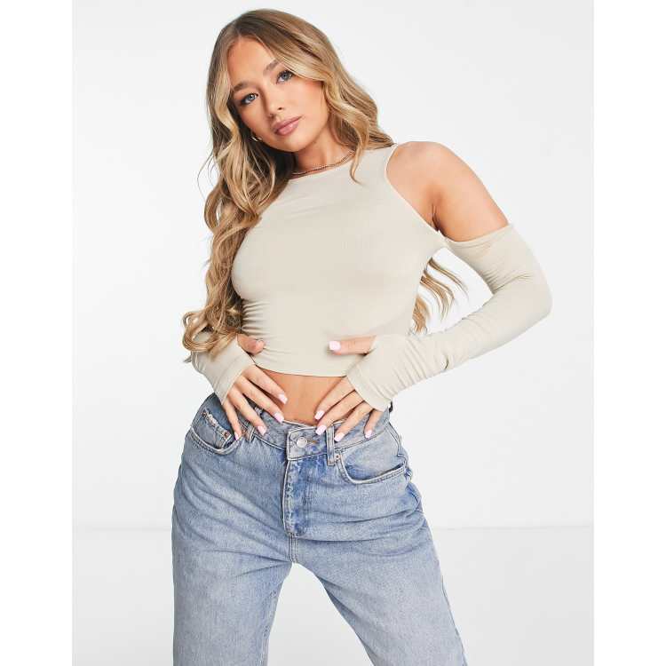 ASOS DESIGN cold shoulder crop top in stone ASOS