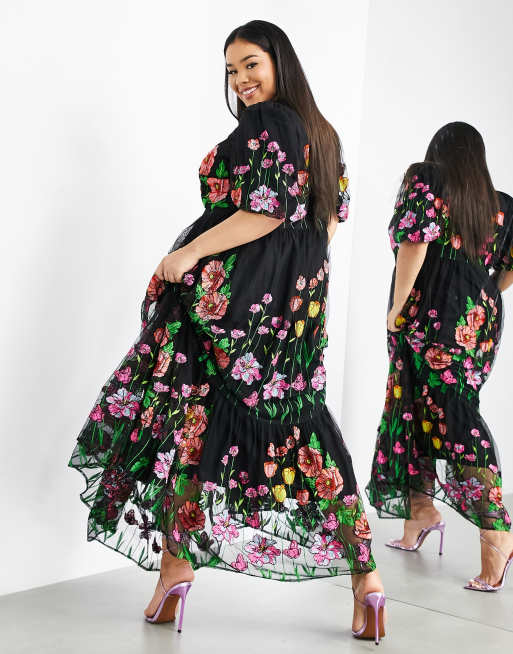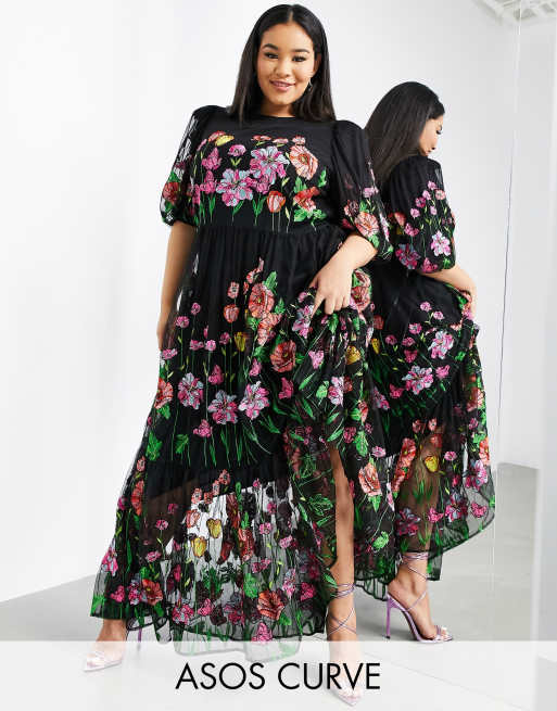 ASOS EDITION Curve embroidered trapeze maxi dress with puff sleeve in black