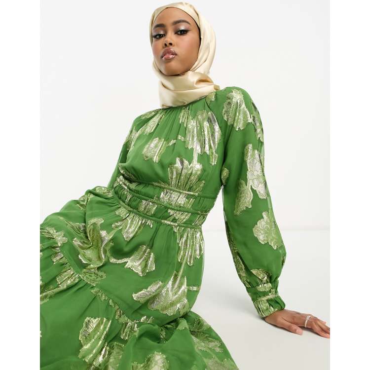 ASOS DESIGN metallic channel detail maxi dress with puff sleeves
