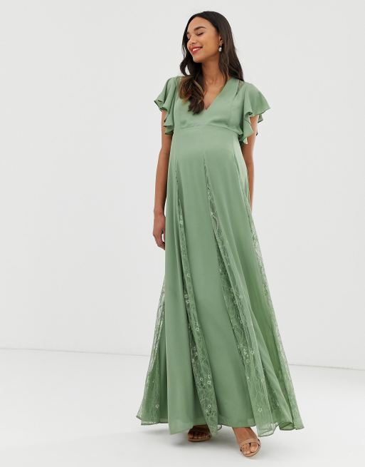 ASOS DESIGN Maternity Bridesmaid pleated flutter sleeve maxi dress with satin wrap waist in olive