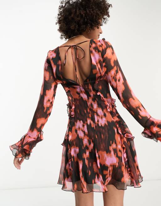 ASOS DESIGN Tall ruffle tie front plunge mini dress with frill sleeves in burnt orange lava print