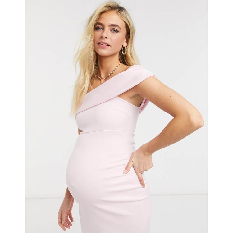 ASOS DESIGN Maternity baby shower fallen shoulder scuba midi dress in soft pink