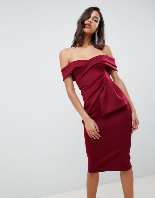 Bardot fold wrap front midi clearance pencil dress, ASOS design Bardot fold wrap front midi pencil dress clearance