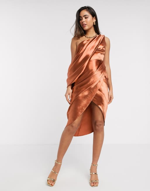 Asos one shoulder midi clearance dress in hammered satin, ASOS DESIGN one shoulder drape detail midi dress clearance