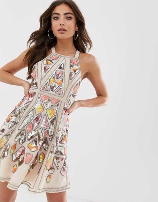 ASOS DESIGN Tall mini dress with wrap neck and aztec embellishment fringe