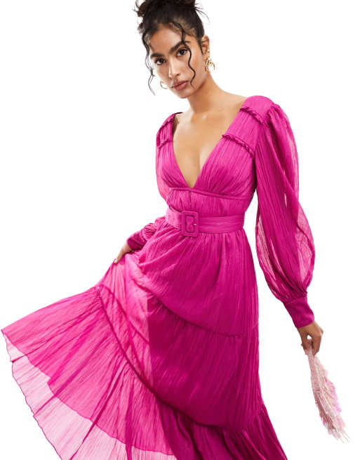 ASOS DESIGN micro pleat plunge neck maxi dress with cross back in magenta