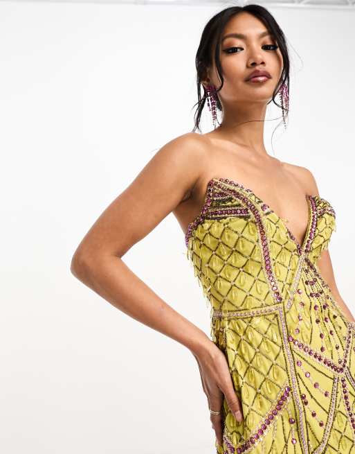 Asos yellow embellished clearance dress, ASOS DESIGN embellished structured plunge mini dress with curve hem in yellow clearance