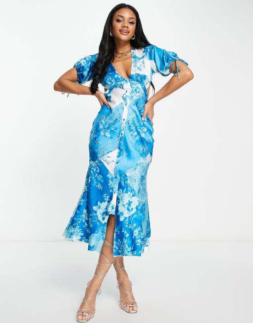 Asos blue floral clearance midi dress, ASOS DESIGN satin midi dress with button through detail in patwork blue floral clearance