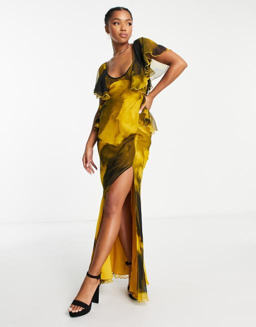 ASOS DESIGN ruffle shoulder maxi dress with open back in abstract print in black and yellow