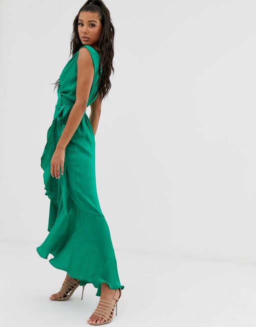 Asos clearance flounce dress, Flounce London wrap front satin midaxi dress in emerald green ASOS clearance