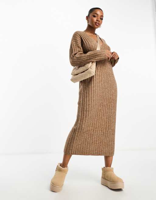 ASOS DESIGN knitted v neck maxi dress in rib in camel