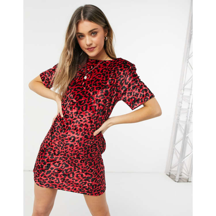 ASOS DESIGN padded shoulder short sleeve t shirt mini dress in red velvet leopard print