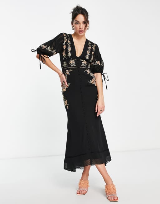 ASOS DESIGN dobby floral embroidered midi tea dress with tie