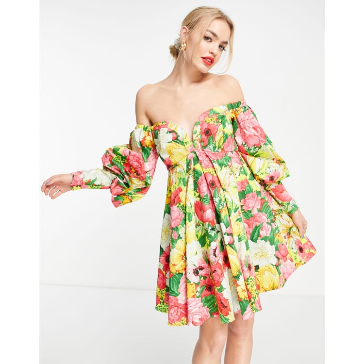 ASOS Premium Off The Shoulder Bardot Midi Prom Dress In Garden Floral
