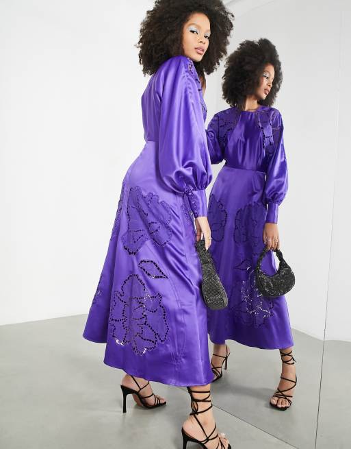 Asos purple midi clearance dress, ASOS EDITION cutwork long sleeve satin midi dress in purple ASOS clearance
