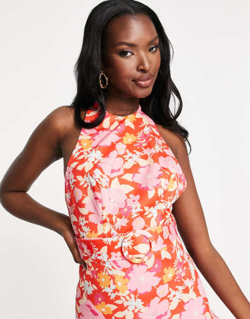 ASOS DESIGN halter belted midi prom dress in red floral print ASOS