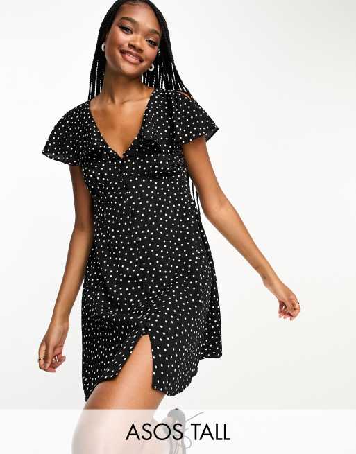 ASOS DESIGN Tall tie front long sleeve mini tea dress in black spot