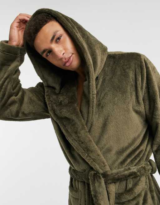 ASOS DESIGN lounge hooded dressing gown in khaki fleece