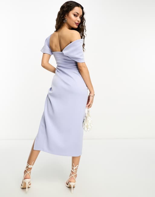 ASOS DESIGN Petite off shoulder draped wrap midi dress in cosmic blue