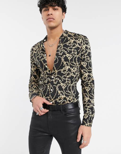 Asos chain print clearance dress, ASOS DESIGN revere collar skinny chain print shirt with deep clearance