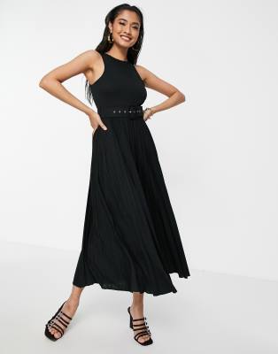 ASOS DESIGN pleated sleeveless midi dress with belt in black
