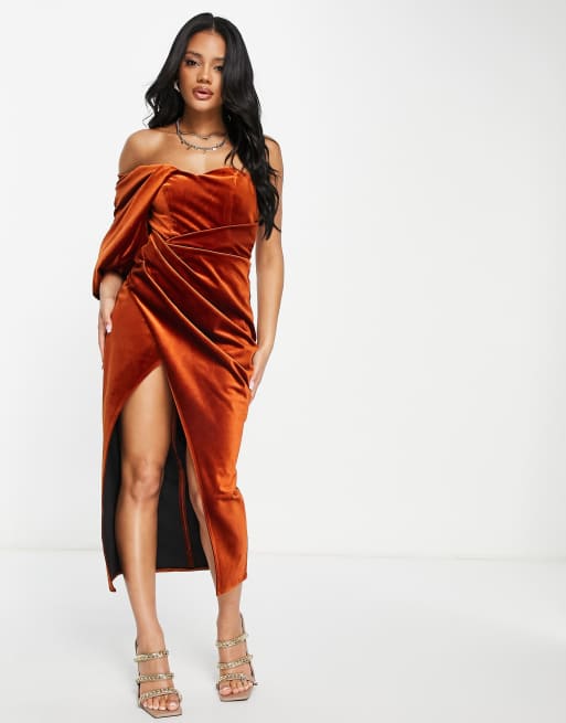 ASOS DESIGN balloon sleeve velvet midi dress with tie waist in rust